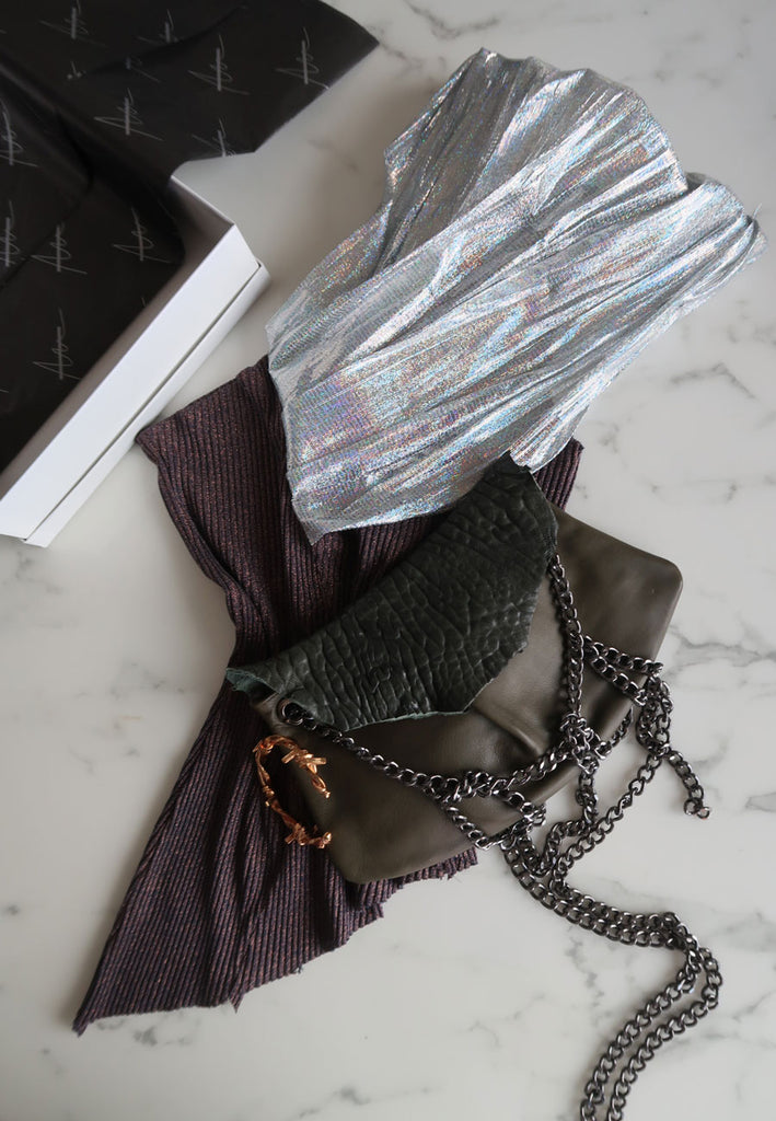 The green leather chain bag grounds the composition. With its textured flap and dark metal chain, it brings a refined ruggedness that feels both lived-in and elevated—like something pulled from a private collection.
