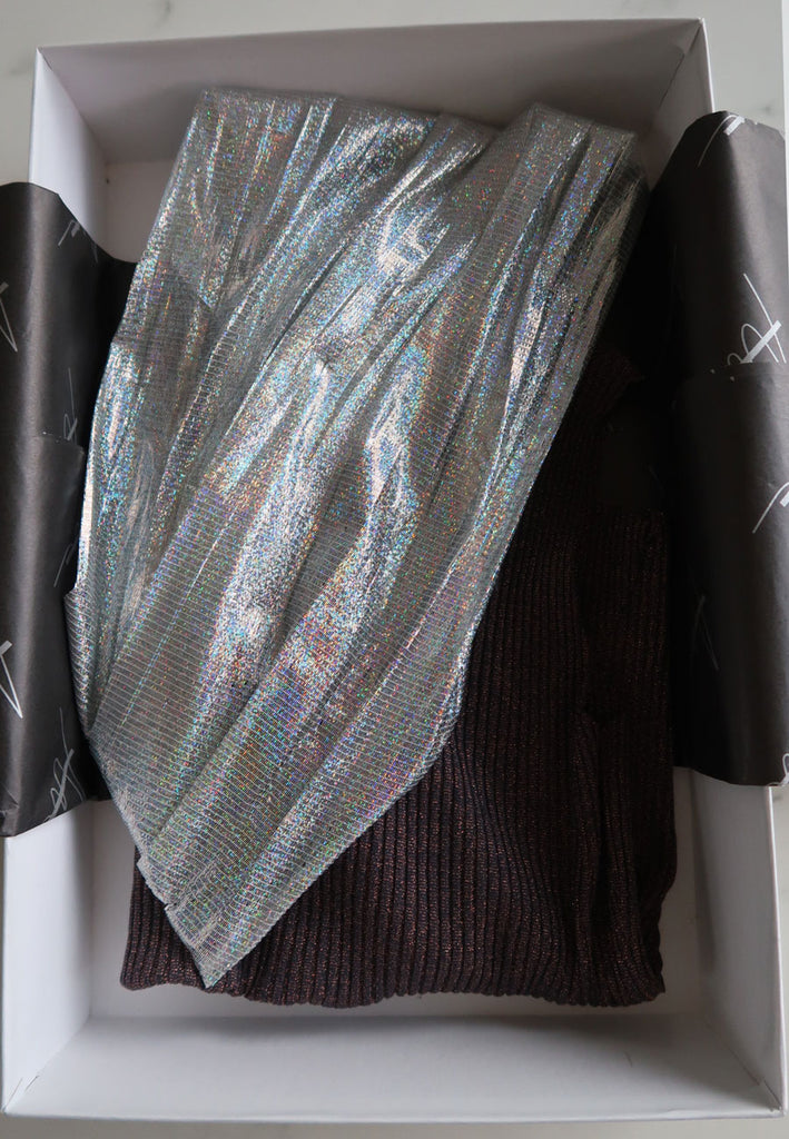The glassic one-shoulder top is your spotlight moment. Its iridescent, glass-like sheen catches light the way a polished surface would under gallery lamps—fluid, modern, and impossible to overlook.