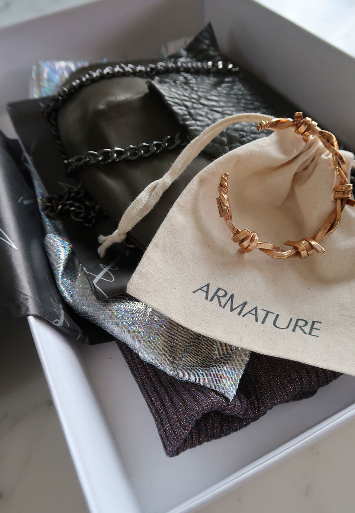 The Rose gold barbed-wire bracelet is the sculptural piece. Sharp, high-shine, and effortlessly bold, it wraps the wrist like a tiny installation with attitude.
