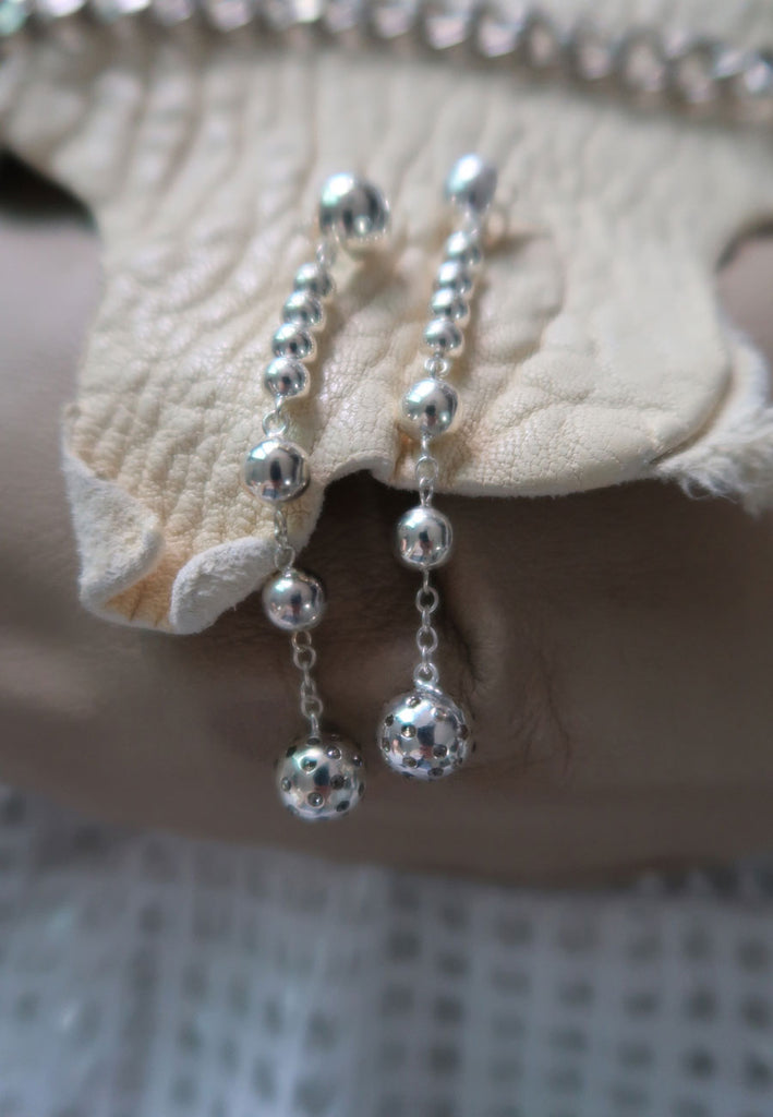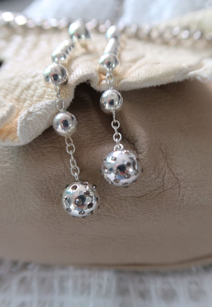 Handcrafted in gleaming silver, these dangle earrings feature sculptural sphere elements adorned with raw gray diamonds. The natural, uncut stones lend organic beauty and a modern edge, balancing brilliance with understated sophistication. Elegant movement and artisanal detail make these earrings a luxurious accent for any outfit.