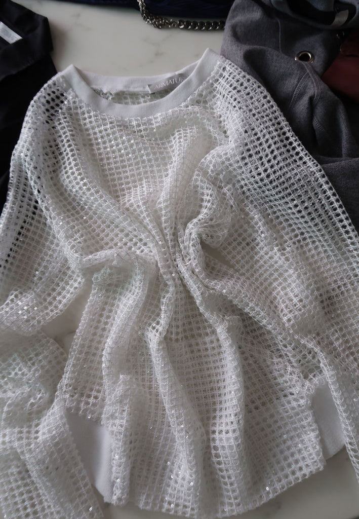Wrap yourself in luminous texture with this standout sweater, crafted from a crochet-style novelty fabric intricately stitched with shimmering sequins. The open-grid pattern creates airy dimension, while the soft inner layer ensures comfort and warmth. Its subtle sparkle and unique textile make it a true statement piece—perfect for elevating everyday looks or adding a polished touch to evening ensembles.