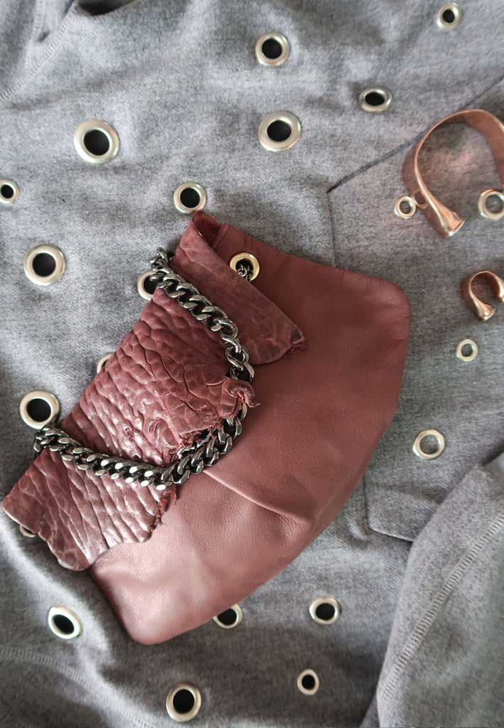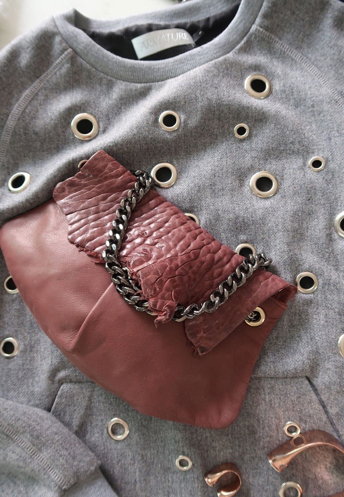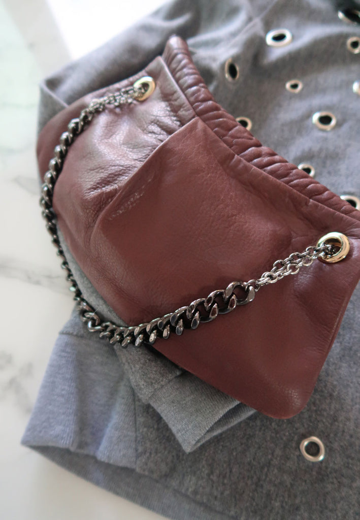 Crafted from richly textured leather, this bag brings depth and character to any outfit. Its rugged, naturally distressed finish pairs beautifully with the slouchy silhouette, while a bold metal chain adds weight and attitude. With its earthy maroon tone and tactile mix of smooth and pebbled leather, it channels Western grit with contemporary sophistication.
