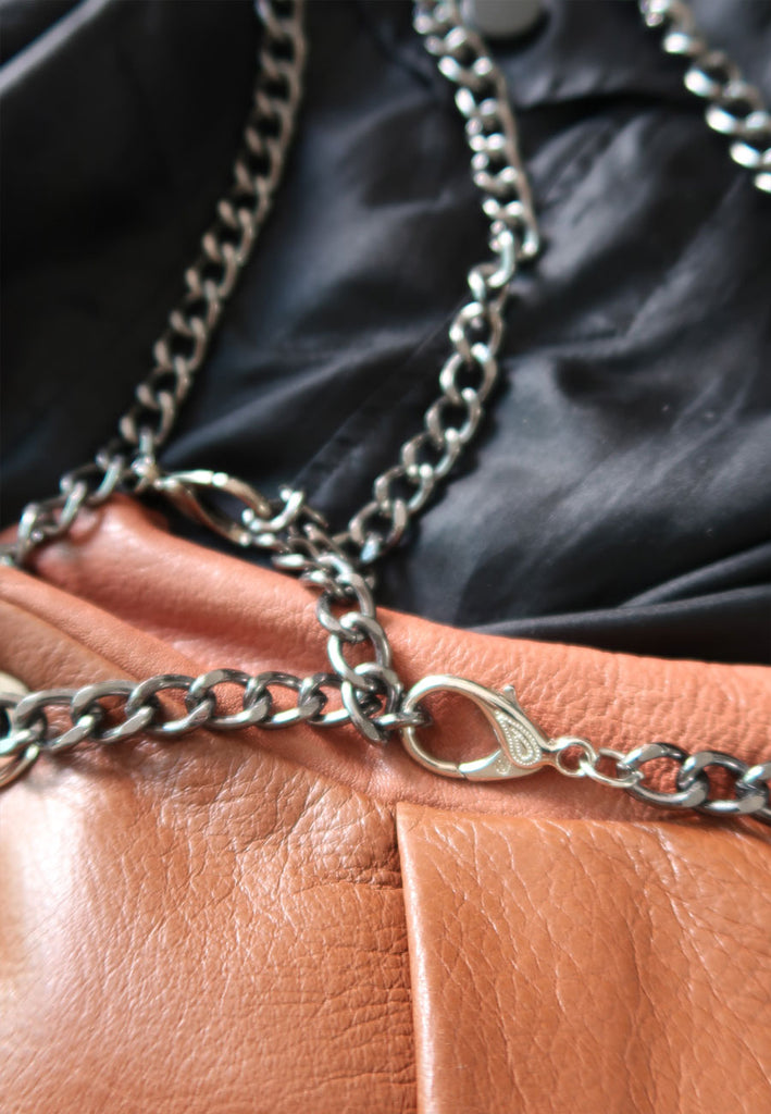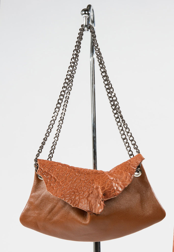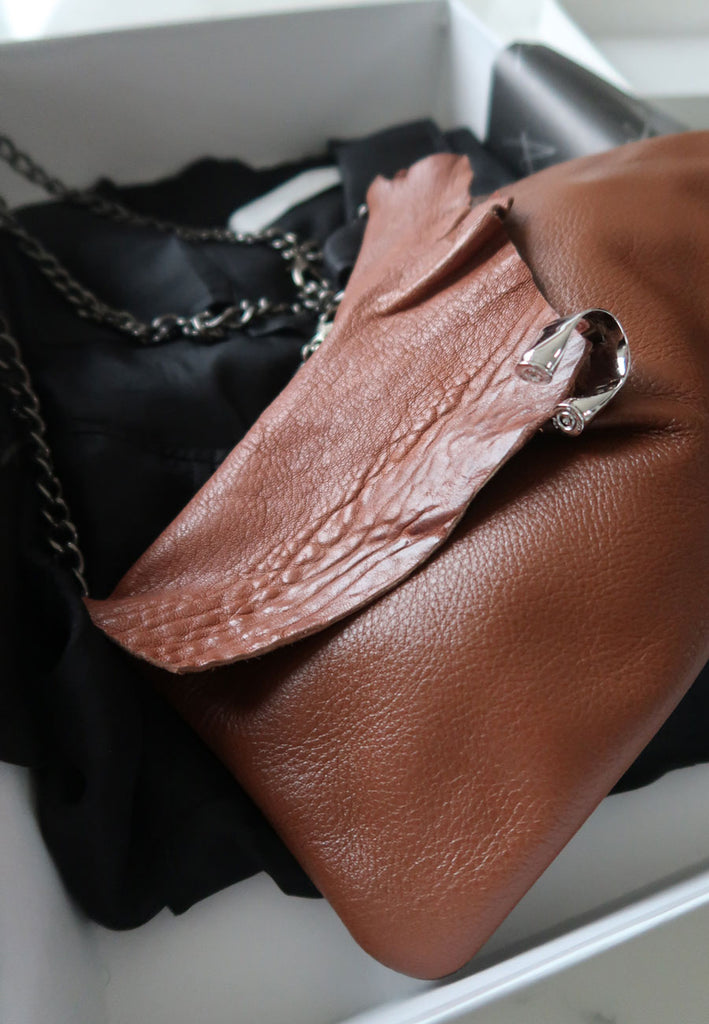 Handmade in Los Angeles using sustainably sourced luxury leather remnants, this crossbody features a raw-edge sculpted flap and a heavy, hand-designed chain strap. Produced in under five units, each piece has its own natural leather variations, bringing a subtle western ruggedness to an otherwise sleek city silhouette.