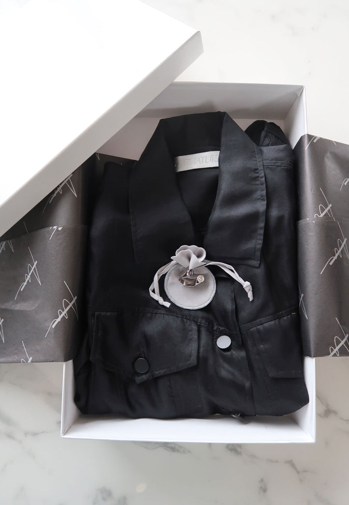 Lightweight but structured, this jacket is crafted from double layers of sheer silk organza, giving it a soft, architectural drape. Matte black hardware and denim-inspired seaming create a modern reinterpretation of the classic trucker jacket — airy, refined, and undeniably urban.