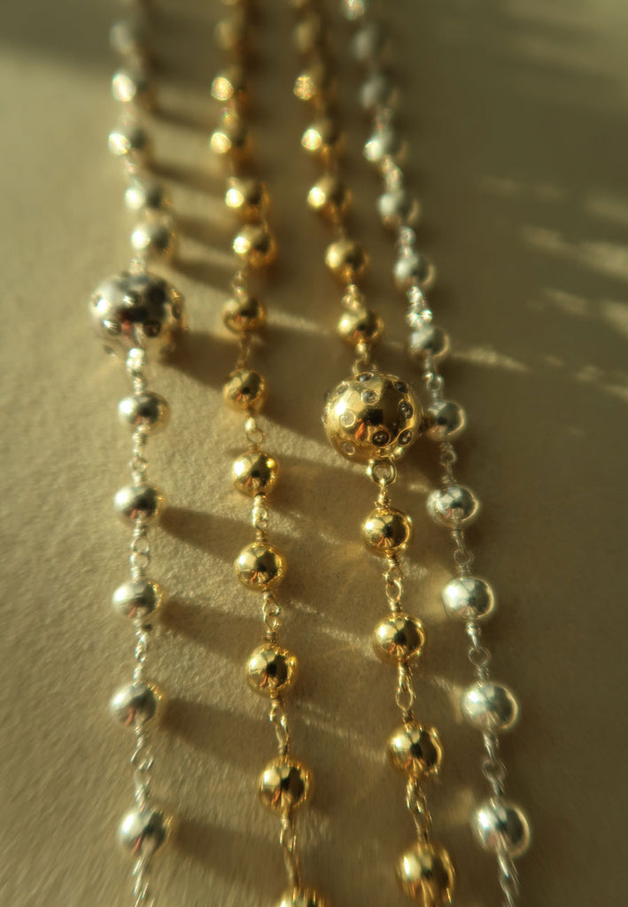 A modern reinterpretation of an old-world silhouette, this two-piece chain bundle blends tradition with contemporary edge. Crafted in micro-batches, each necklace features a sequence of polished beads — reminiscent of classic rosaries — reimagined in precious metals and finished with a singular, sculptural centerpiece.