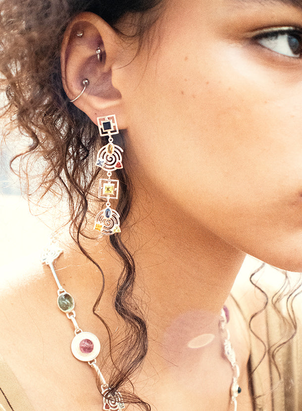 Inspired by the Impressionist era, the collection celebrates light—its shifting hues and ethereal glow—captured in cabochons and faceted precious gems. Sapphires, emeralds, rubies, peridot, iolite, citrine, milky aquamarine, tanzanite, and multi-colored tourmaline are delicately linked by smooth silver bars, floating gracefully within spiraling forms.